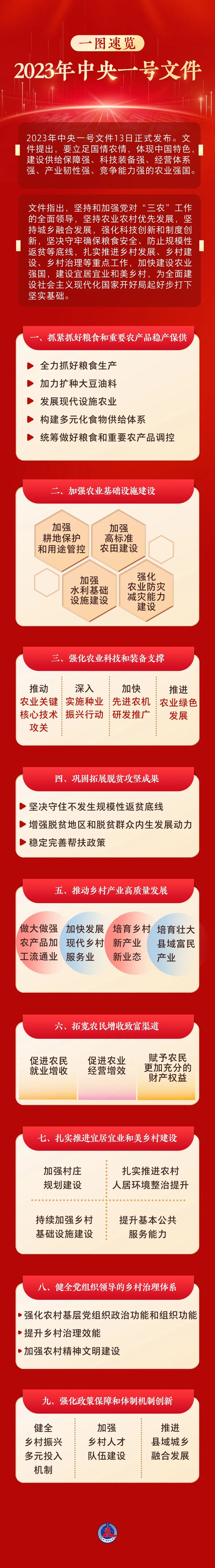 2023年中央一號文件公布 提出做好2023年全面推進鄉村振興重點工作 21世紀以來第20個指導“三農”工作的中央一號文件13日由新華社受權發布。 這份文件題為《中共中央 國務院關于做好2023年全面推進鄉村振興重點工作的意見》,全文共九個部分,包括:抓緊抓好糧食和重要農產品穩產保供、加強農業基礎設施建設、強化農業科技和裝備支撐、鞏固拓展脫貧攻堅成果、推動鄉村產業高質量發展、拓寬農民增收致富渠道、扎實推進宜居宜業和美鄉村建設、健全黨組織領導的鄉村治理體系、強化政策保障和體制機制創新。 文件指出,全面建設社會主義現代化國家,最艱巨最繁重的任務仍然在農村。世界百年未有之大變局加速演進,我國發展進入戰略機遇和風險挑戰并存、不確定難預料因素增多的時期,守好“三農”基本盤至關重要、不容有失。黨中央認為,必須堅持不懈把解決好“三農”問題作為全黨工作重中之重,舉全黨全社會之力全面推進鄉村振興,加快農業農村現代化。 文件提出,堅決守牢確保糧食安全、防止規模性返貧等底線,扎實推進鄉村發展、鄉村建設、鄉村治理等重點工作,加快建設農業強國,建設宜居宜業和美鄉村。 中央農村工作領導小組辦公室有關負責人表示,要全面貫徹落實黨的二十大精神,深入貫徹落實習近平總書記關于“三農”工作的重要論述,全面落實鄉村振興責任制,真抓實干做好2023年重點工作,不折不扣完成好既定目標任務,推動全面推進鄉村振興不斷取得新進展、農業強國建設開好局起好步。 |