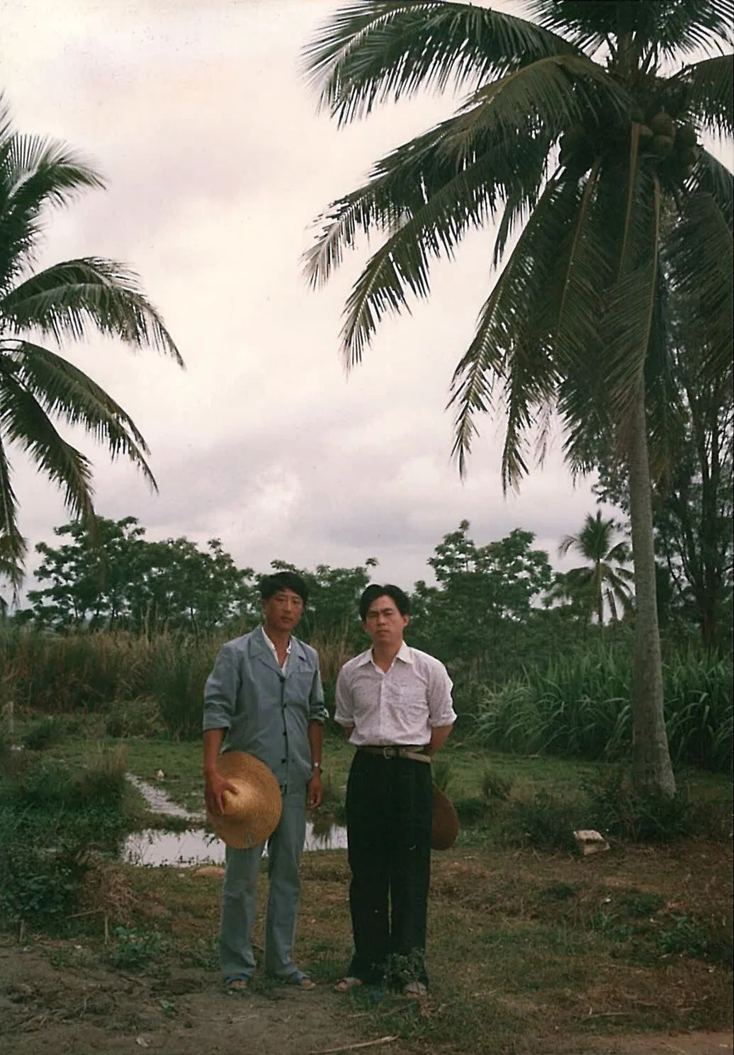 1987年1月,鄧兆安(右)在采訪李登海時,參觀了他在海南的第一個育種基地。