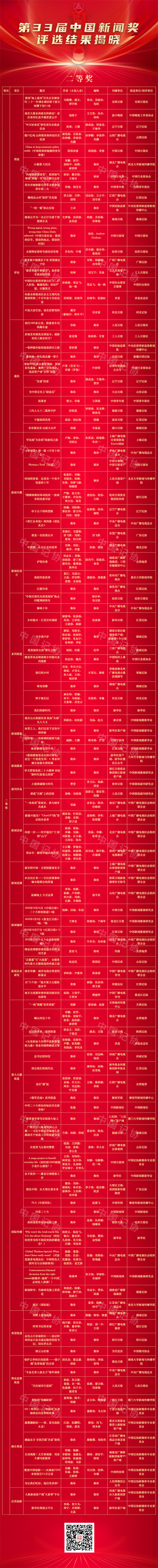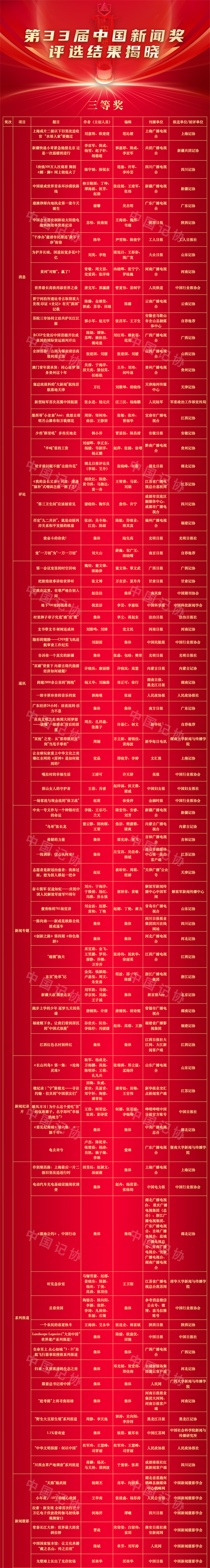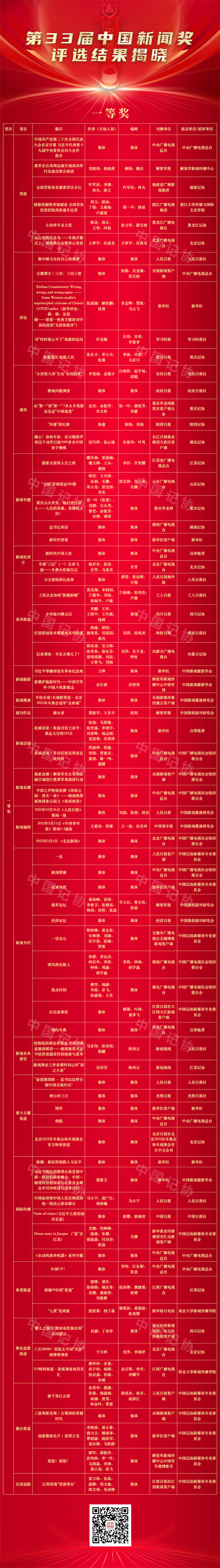 由中華全國新聞工作者協(xié)會主辦的第33屆中國新聞獎評選結(jié)果11月6日揭曉。來自全國各級各類媒體的377件作品獲中國新聞獎,其中,特別獎3件,一等獎73件,二等獎114件,三等獎187件。 人民日報社評論《十年砥礪奮進 繪寫壯美畫卷——寫在黨的二十大勝利召開之際》、新華社通訊《為中國人民謀幸福 為中華民族謀復(fù)興——黨的十八大以來以習(xí)近平同志為核心的黨中央治國理政紀(jì)實》和中央廣播電視總臺新聞直播《中國共產(chǎn)黨第二十屆中央政治局常委同中外記者見面會》3件作品得到與會評委高度認(rèn)同,獲選特別獎。 此次評選中,涌現(xiàn)出多件反映2022年重點工作、重要活動、先進典型、融合趨勢的優(yōu)秀新聞作品。例如,宣傳黨和國家領(lǐng)導(dǎo)人重要思想和活動的報道《奮進強國路·總書記這樣引領(lǐng)中國式現(xiàn)代化》、迎接黨的二十大勝利召開的政論片《領(lǐng)航》、展現(xiàn)新時代青春力量的典型報道《中國UP!》、體現(xiàn)媒體融合創(chuàng)新的作品《新千里江山圖》等榮獲一等獎。 《鄉(xiāng)村振興蹲點記》《鐵路投融資體制破冰 全國首條民營控股高鐵通車運營》《記者調(diào)查·羊皮去哪兒了?》等作品體現(xiàn)了新聞工作者關(guān)注社會熱點和民生民情、深入基層扎實采訪調(diào)研、不斷增強“四力”、錘煉精品力作的優(yōu)良作風(fēng)。 中國記協(xié)將于近期舉辦中國新聞獎和長江韜奮獎頒獎報告會,為獲獎?wù)叽眍C獎。